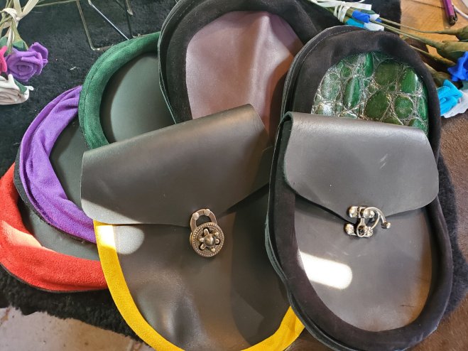 Added in 2015.  Molded leather roses, hand painted.  Can be worn as a hairclip, on a scarf, jacket, hat.  Also made attached to a leather band to worn as a bracelet or wrapped around a scarf.